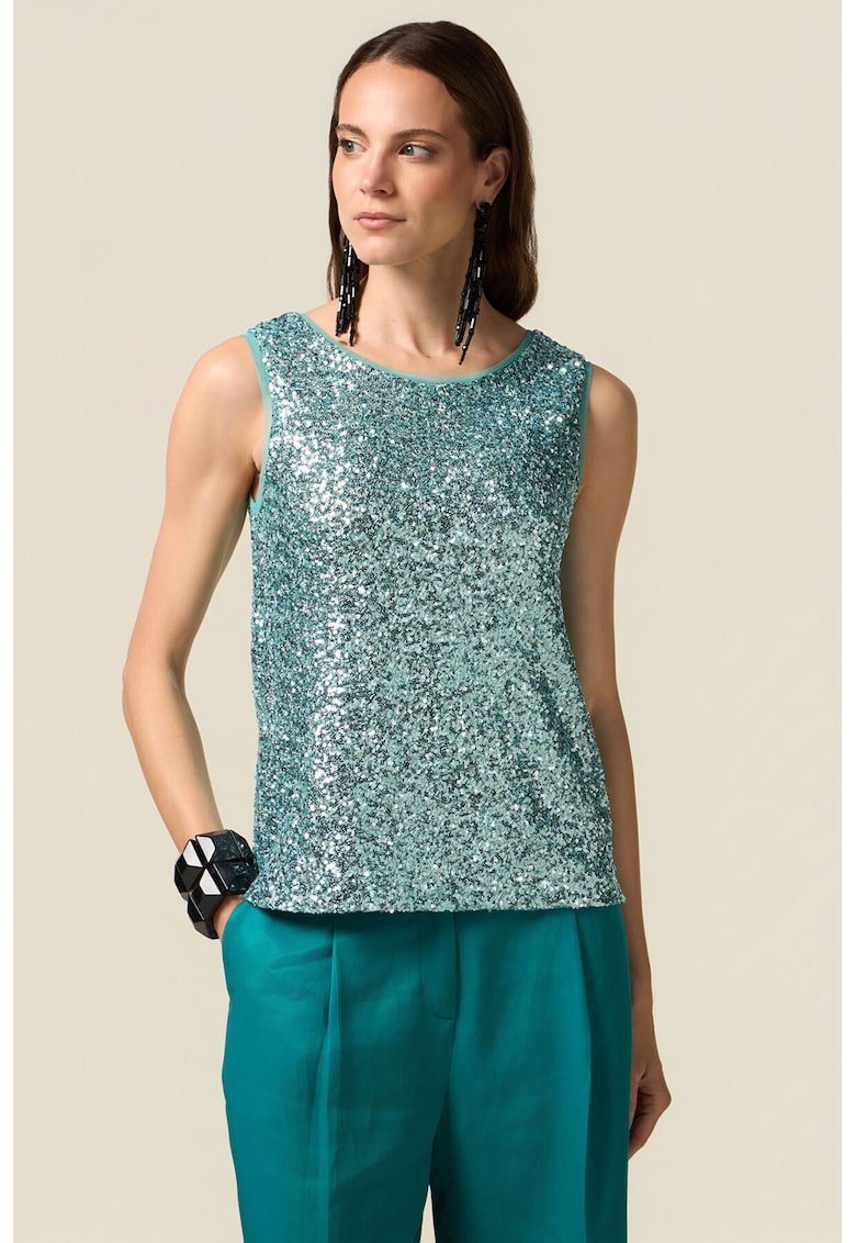Caracteristici Culoare: verde marin Imprimeu: uni Stil: casual Croiala: regular fit Sistem inchidere: fara inchidere Material: sintetic Decolteu: rotund Lungime maneca: fara maneca Detalii: aspect stralucitor Compozitie Exterior: 95% poliester