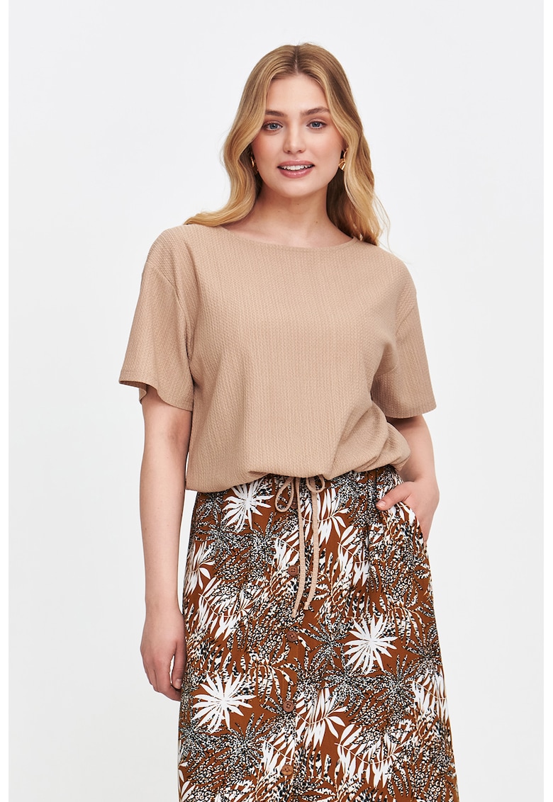Caracteristici Culoare: maro nisip Imprimeu: uni Stil: casual Croiala: lejer Sistem inchidere: fara inchidere Material: poliester Decolteu: barcuta Maneci: cazute Lungime maneca: maneca scurta Detalii: texturata Compozitie Exterior: 97% poliester