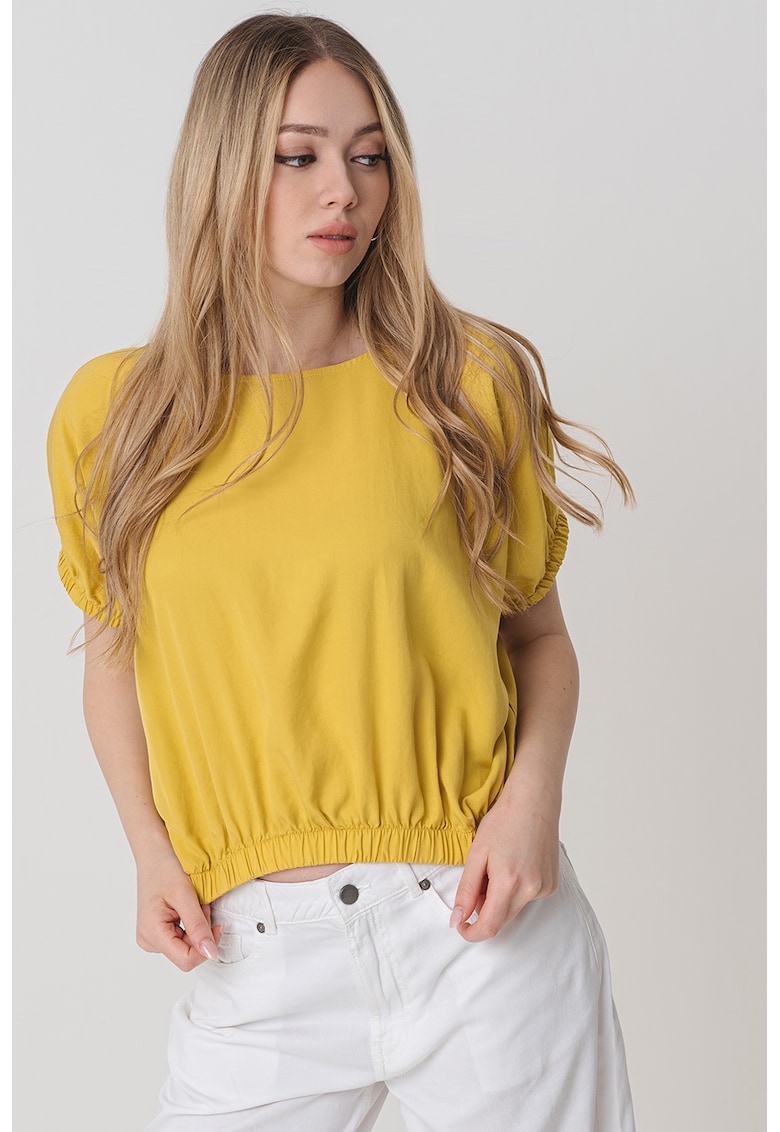 Caracteristici Culoare: galben pai Imprimeu: uni Stil: casual Croiala: crop Sistem inchidere: fara inchidere Material: lyocell Decolteu: barcuta Lungime maneca: maneca scurta Compozitie Exterior: 100% lyocell Info model Modelul poarta un produs de marimea S. Marimi model: 175 cm inaltime