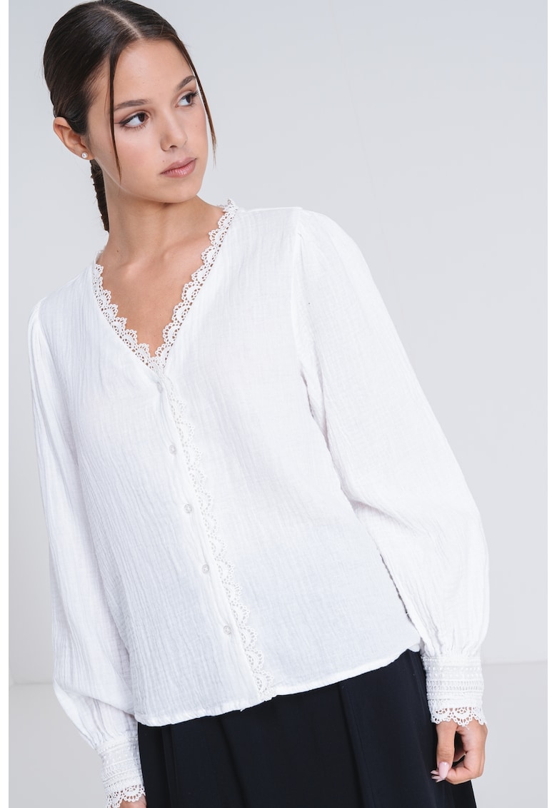 Caracteristici Culoare: alb Imprimeu: uni Stil: casual Croiala: lejer Sistem inchidere: nasturi Material: bumbac Decolteu: in v Lungime maneca: maneca lunga Compozitie Exterior: 100% bumbac organic Info model Modelul poarta un produs de marimea S. Marimi model: 174 cm inaltime