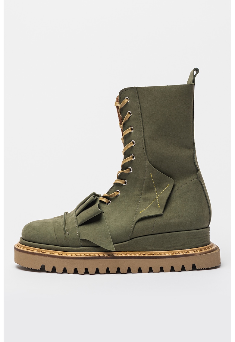Caracteristici Tip: cu toc Culoare: kaki Material: piele intoarsa Imprimeu: uni Stil: casual Varf: rotund Tip talpa: flatform Culoare elemente metalice: argintiu Sistem inchidere: siret Compozitie Partea superioara: piele intoarsa Material interior: piele Material talpa: alte materiale Dimensiuni Platforma spate: 5.5 cm