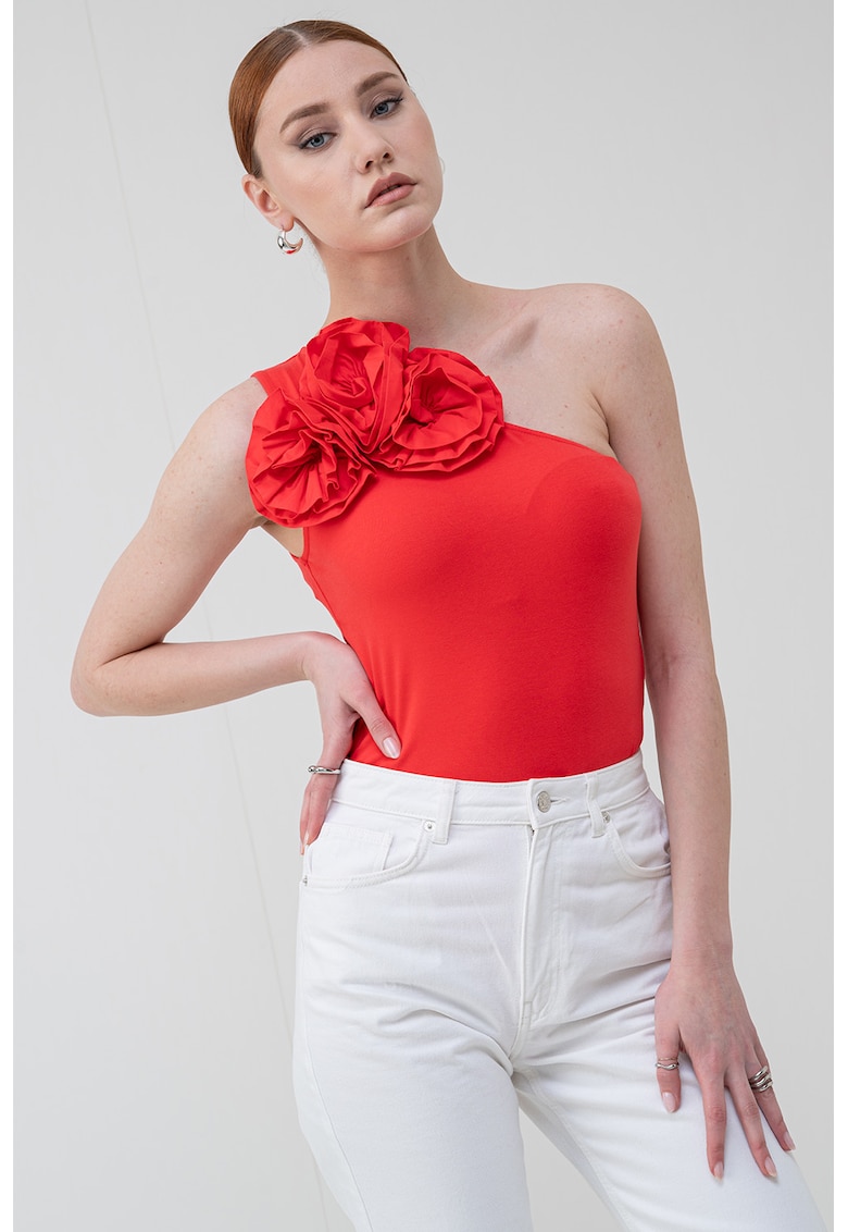 Caracteristici Culoare: coral Imprimeu: uni Material: bumbac Croiala: decolteu pe un umar Model: in v Lungime maneca: fara maneca Compozitie Exterior: 96% bumbac