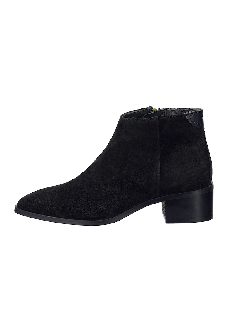 Caracteristici Tip: cu toc Culoare: negru Material: piele intoarsa Imprimeu: uni Stil: casual Varf: alungit Tip toc: masiv Culoare elemente metalice: auriu Sistem inchidere: fermoar Compozitie Partea superioara: piele intoarsa Material interior: textil Material talpa: alte materiale