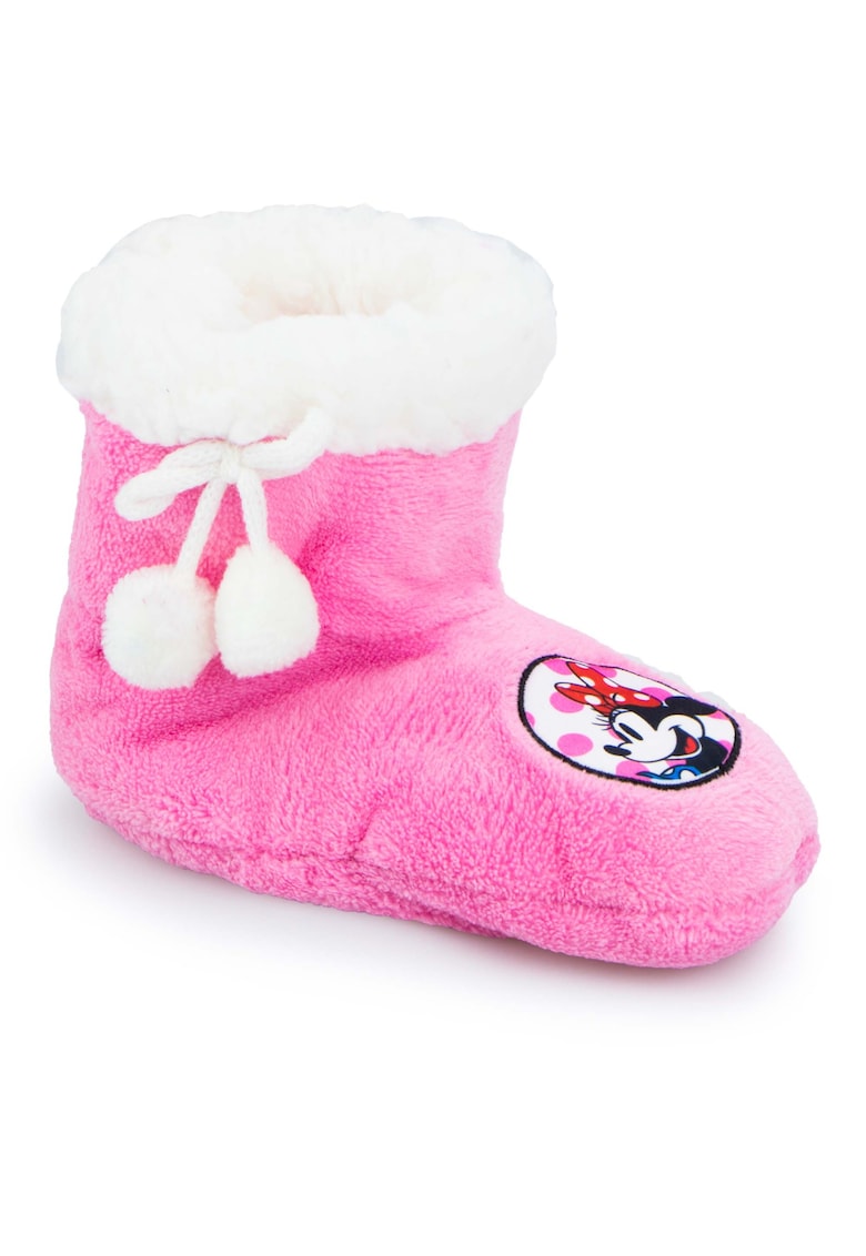 - iarna Poveste/Personaj: minnie mouse Sistem inchidere: fara inchidere Culoare: roz Detalii material Material interior: 100% poliester Material talpa: moale -flexibila cu striatii -antiderapanta