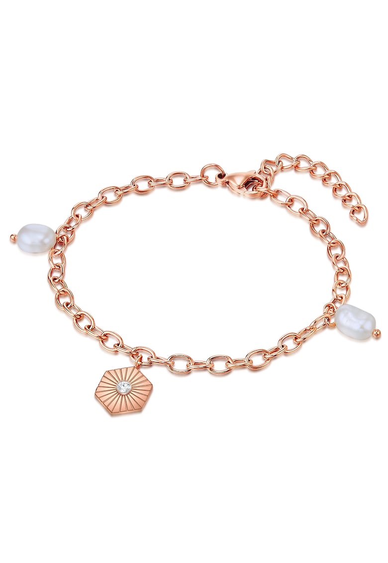 Caracteristici Tip produs: bratara Material: inox Culoare: auriu rose Detalii: perle de apa dulce