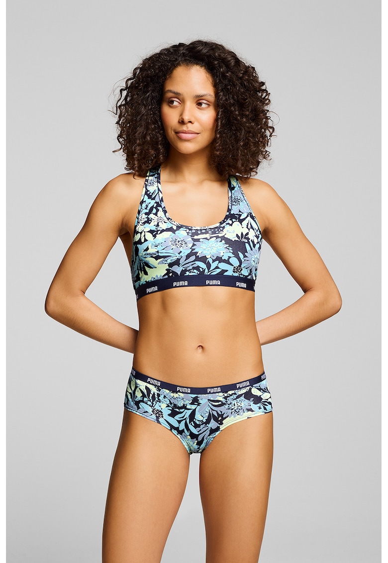 - albastru inchis Material: bumbac Imprimeu: floral Forma cupa: acoperire completa Burete cupa: fara burete Sustinere metalica: fara sarma Detalii: spate decupat
