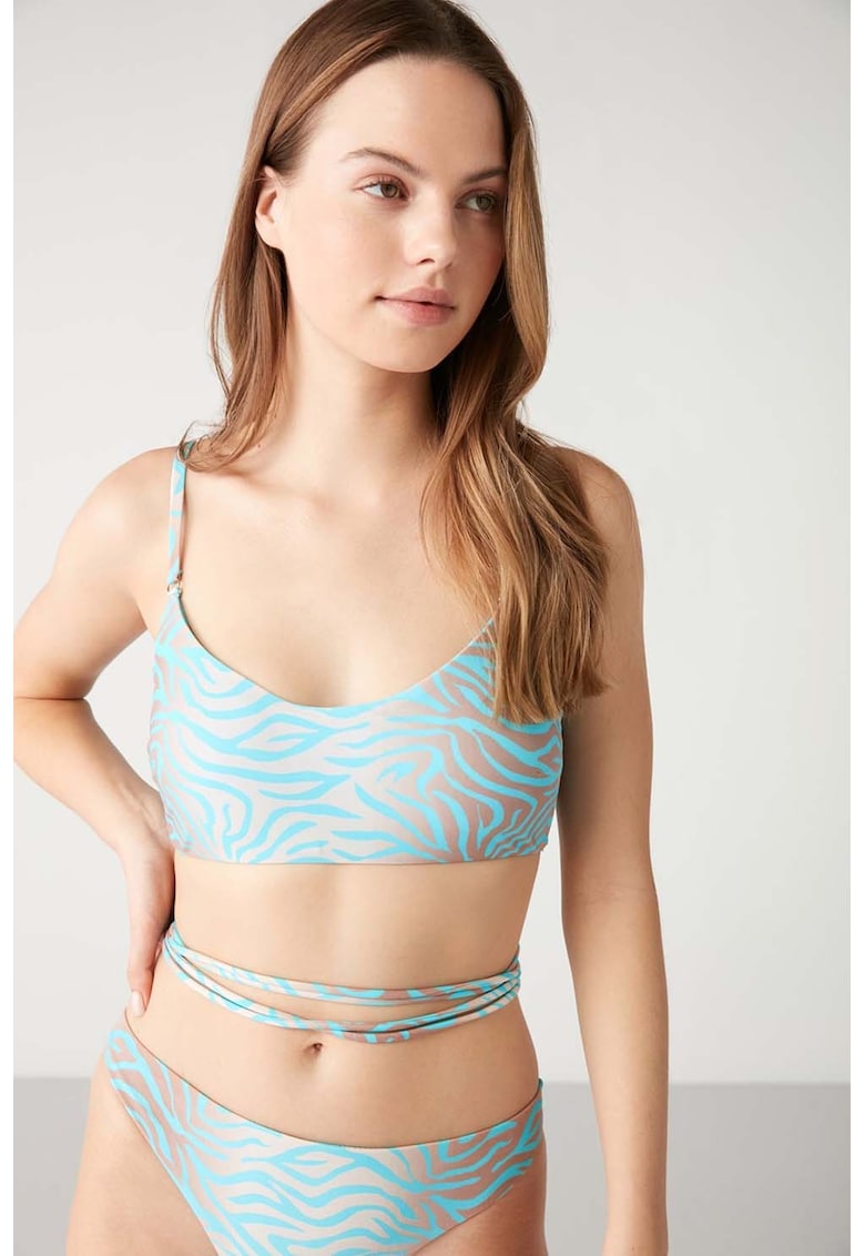 Detalii generale Tip produs: bustiera Culoare: turcoaz Imprimeu: animal print Forma cupa: bralette Material: sintetic Sistem inchidere: fara inchidere Design Tip sutien: cu burete Sustinere metalica: fara sarma Stil decolteu: amplu Stil spate: u Compozitie Exterior: 80% poliamida