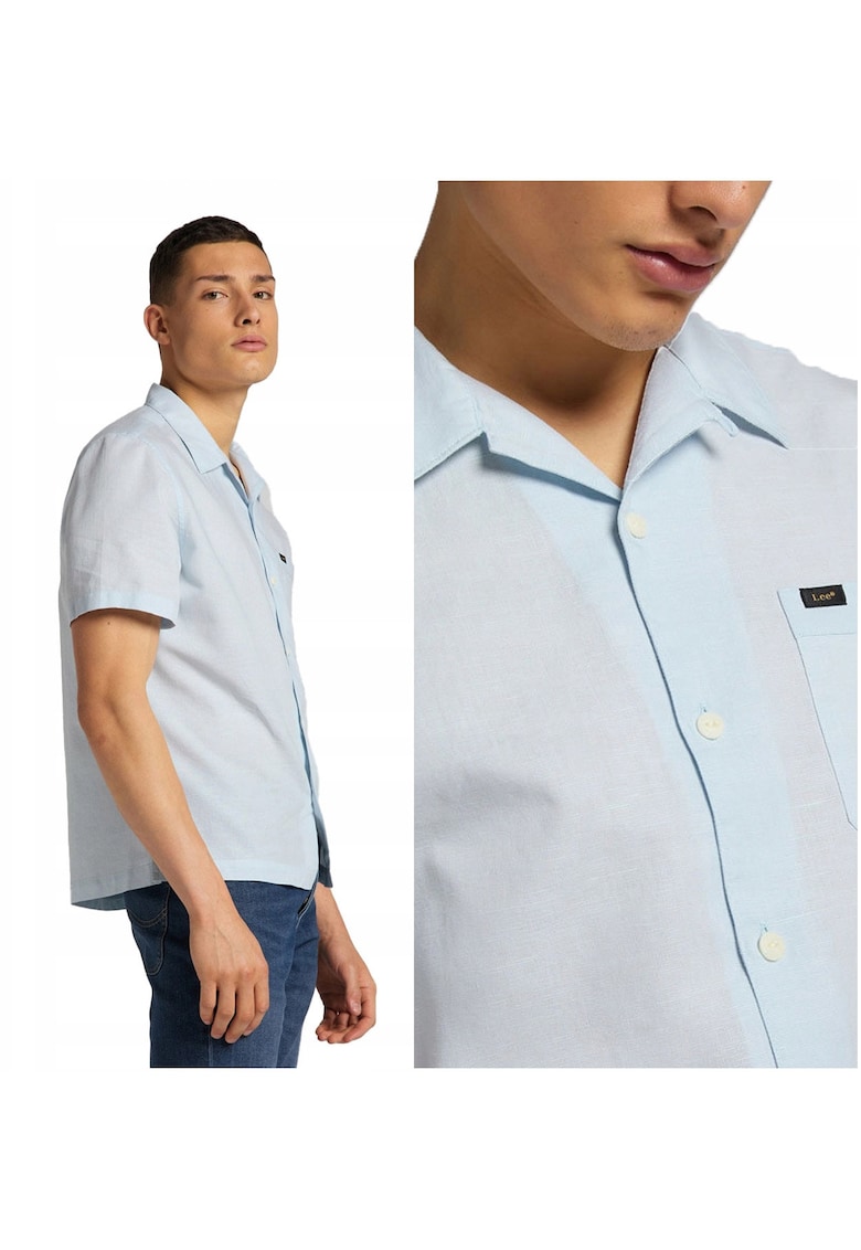 Caracteristici Culoare: albastru Material: bumbac Imprimeu: uni Stil: elegant Croiala: regular fit Lungime maneca: maneca scurta Buzunare: 1 buzunar Detalii: amestec de in Sistem inchidere: nasturi Linie Brand: lee Compozitie Exterior: 63% bumbac