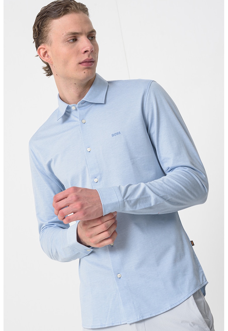 Caracteristici Culoare: albastru lavanda Material: bumbac Imprimeu: logo Stil: elegant Croiala: cambrata Guler: clasic Lungime maneca: maneca lunga Sistem inchidere: nasturi Compozitie Exterior: 100% bumbac Info model Modelul poarta un produs de marimea M. Marimi model: 170 cm inaltime