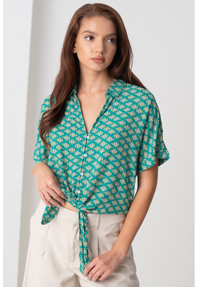 Caracteristici Culoare: verde Imprimeu: geometric Stil: casual Material: viscoza Croiala: crop Lungime maneca: maneca medie Sistem inchidere: snur