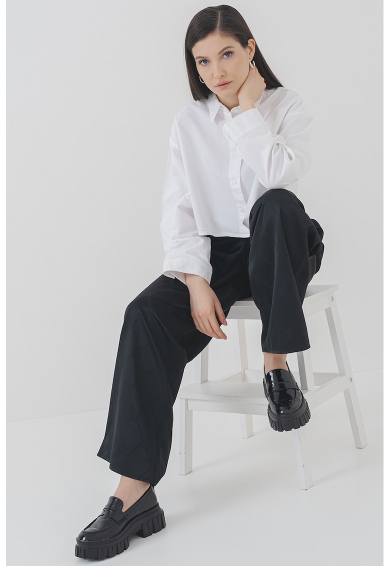 Caracteristici Culoare: alb Imprimeu: uni Stil: elegant Material: bumbac Croiala: crop Guler: ascutit Lungime maneca: maneca lunga Sistem inchidere: nasturi Compozitie Exterior: 100% bumbac Info model Modelul poarta un produs de marimea S/36 EU. Marimi model: 176 cm inaltime