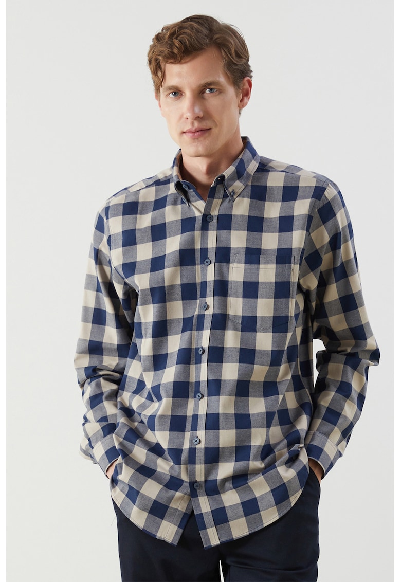 - bej Material: bumbac Imprimeu: carouri Stil: casual Croiala: regular fit Guler: fixat cu nasturi Maneci: cu mansete cu nasturi Lungime maneca: maneca lunga Buzunare: unul aplicat pe piept Sistem inchidere: nasturi Compozitie Exterior: 64% bumbac