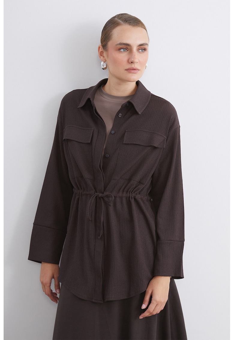 Caracteristici Culoare: maro inchis Imprimeu: uni Stil: casual Material: sintetic Croiala: lejer Guler: clasic Tip maneca: cu mansete Lungime maneca: maneca lunga Buzunare: cu clapa pe piept Detalii: aspect texturat