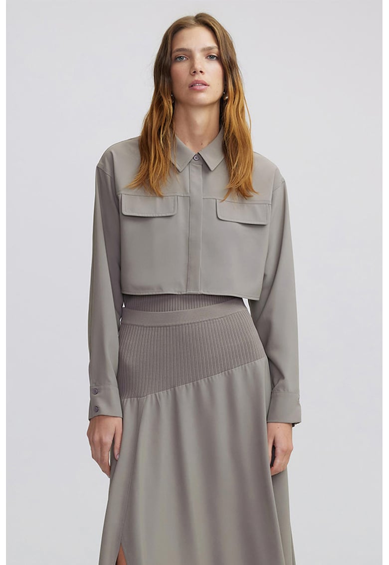 Caracteristici Culoare: maro taupe Imprimeu: uni Stil: casual Material: poliester Croiala: regular fit Guler: ascutit Lungime maneca: maneca lunga Buzunare: 2 sintetice cu clapa Detalii: aspect 2in1