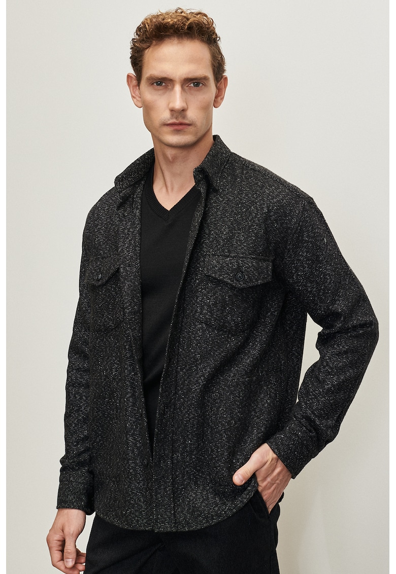 - viscoza Imprimeu: uni Stil: casual Croiala: regular fit Guler: ascutit Lungime maneca: maneca lunga Buzunare: 2 cu clapa pe piept Sistem inchidere: nasturi Compozitie Exterior: 67% poliester