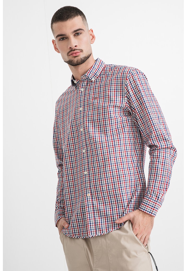 - bleumarin Material: bumbac Imprimeu: carouri Stil: casual Croiala: regular fit Guler: fixat cu nasturi Lungime maneca: maneca lunga Sistem inchidere: nasturi Compozitie Exterior: 100% bumbac Info model Modelul poarta un produs de marimea M. Marimi model: 190 cm inaltime