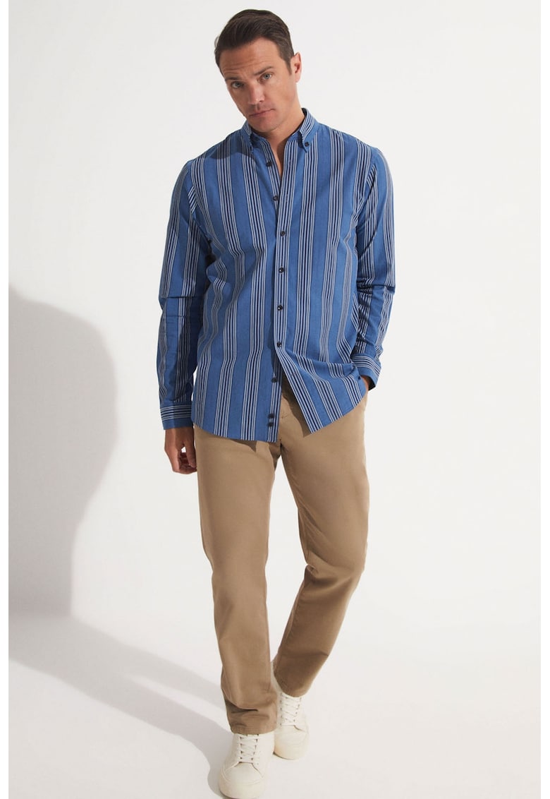 Caracteristici Culoare: albastru deschis Material: bumbac Imprimeu: dungi Stil: casual Croiala: regular fit Guler: fixat cu nasturi Maneci: cu mansete cu nasturi Lungime maneca: maneca lunga Sistem inchidere: nasturi Compozitie Exterior: 99% bumbac