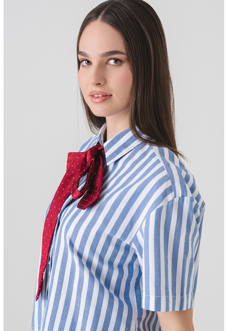 - albastru pastel Imprimeu: dungi Stil: casual Material: bumbac Croiala: lejer Guler: ascutit Lungime maneca: maneca scurta Sistem inchidere: nasturi Compozitie Exterior: 100% bumbac Info model Modelul poarta un produs de marimea 36. Marimi model: 176 cm inaltime