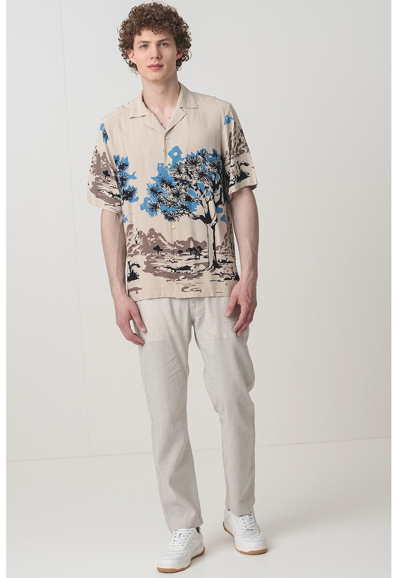 - grej Material: viscoza Imprimeu: grafic Stil: casual Croiala: regular fit Guler: clasic Lungime maneca: maneca scurta Compozitie Exterior: 100% viscoza Info model Modelul poarta un produs de marimea M. Marimi model: 190 cm inaltime