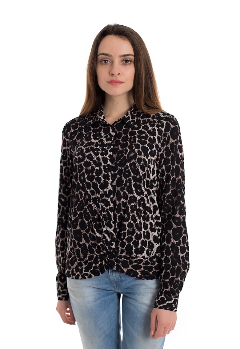 Caracteristici Culoare: maro inchis Imprimeu: animal print Stil: casual Material: viscoza Croiala: regular fit Guler: ascutit Tip maneca: cu mansete Lungime maneca: maneca lunga Detalii: detaliu innodat Sistem inchidere: nasturi Compozitie Exterior: 100% viscoza