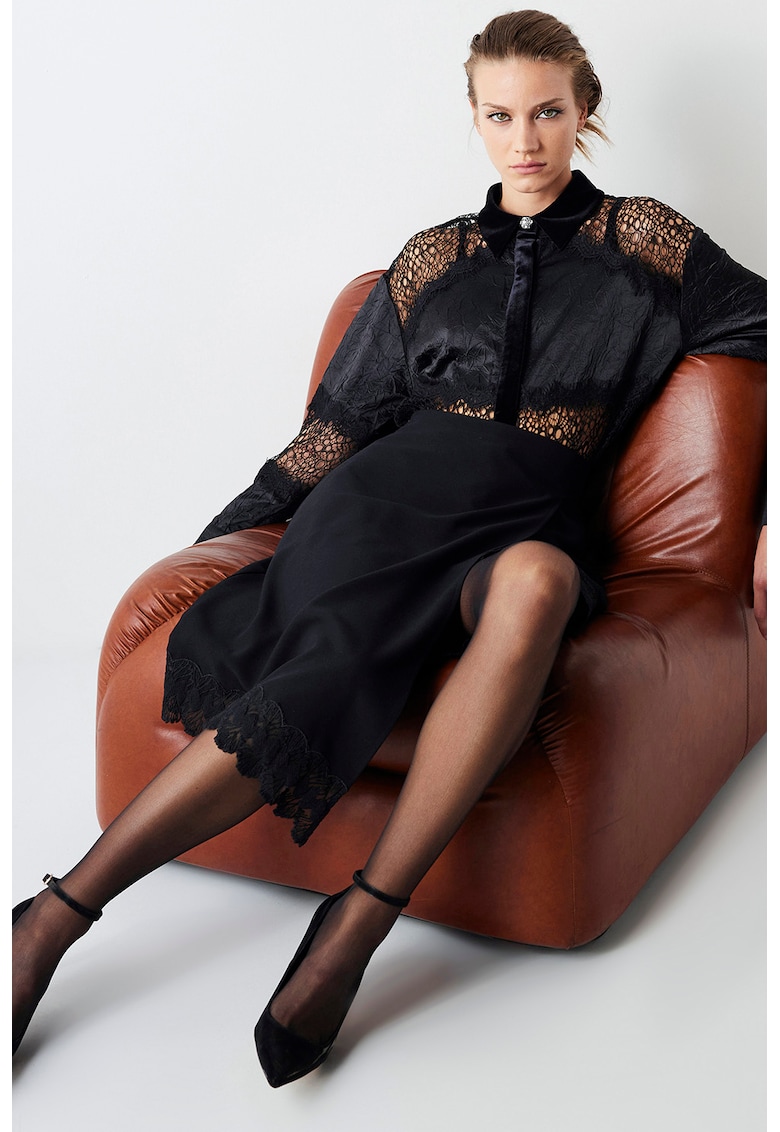 Caracteristici Culoare: negru Imprimeu: uni Stil: elegant Material: poliester Croiala: regular fit Guler: ascutit Lungime maneca: maneca lunga Detalii: insertii de dantela