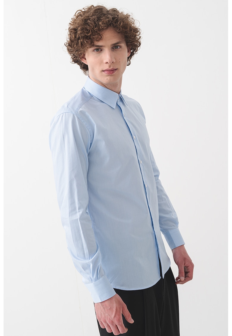 Caracteristici Culoare: albastru azur Material: bumbac Imprimeu: dungi Stil: casual Croiala: regular fit Guler: clasic Lungime maneca: maneca lunga Sistem inchidere: nasturi Compozitie Exterior: 100% bumbac Info model Modelul poarta un produs de marimea 40. Marimi model: 190 cm inaltime