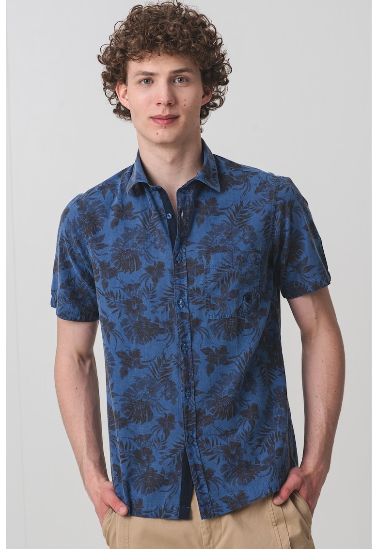 Caracteristici Culoare: albastru inchis Material: bumbac Imprimeu: tropical Stil: casual Croiala: regular fit Guler: ascutit Lungime maneca: maneca scurta Buzunare: 1 pe piept Sistem inchidere: nasturi Compozitie Exterior: 100% bumbac Info model Modelul poarta un produs de marimea M. Marimi model: 190 cm inaltime