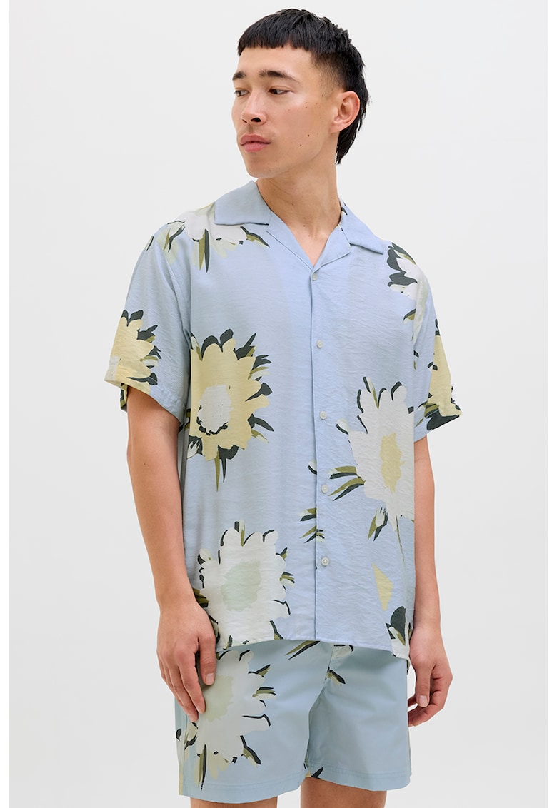 - albastru azur Material: sintetic Imprimeu: abstract Stil: casual Croiala: regular fit Guler: clasic Lungime maneca: maneca scurta Sistem inchidere: nasturi Compozitie Exterior: 85% viscoza lenzing™ecovero™