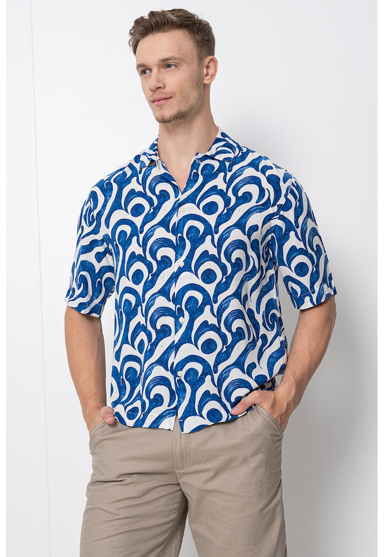 - albastru royal Material: viscoza Imprimeu: abstract Stil: casual Croiala: regular fit Lungime maneca: maneca scurta Sistem inchidere: nasturi Compozitie Exterior: 100% viscoza Info model Modelul poarta un produs de marimea M. Marimi model: 191 cm inaltime