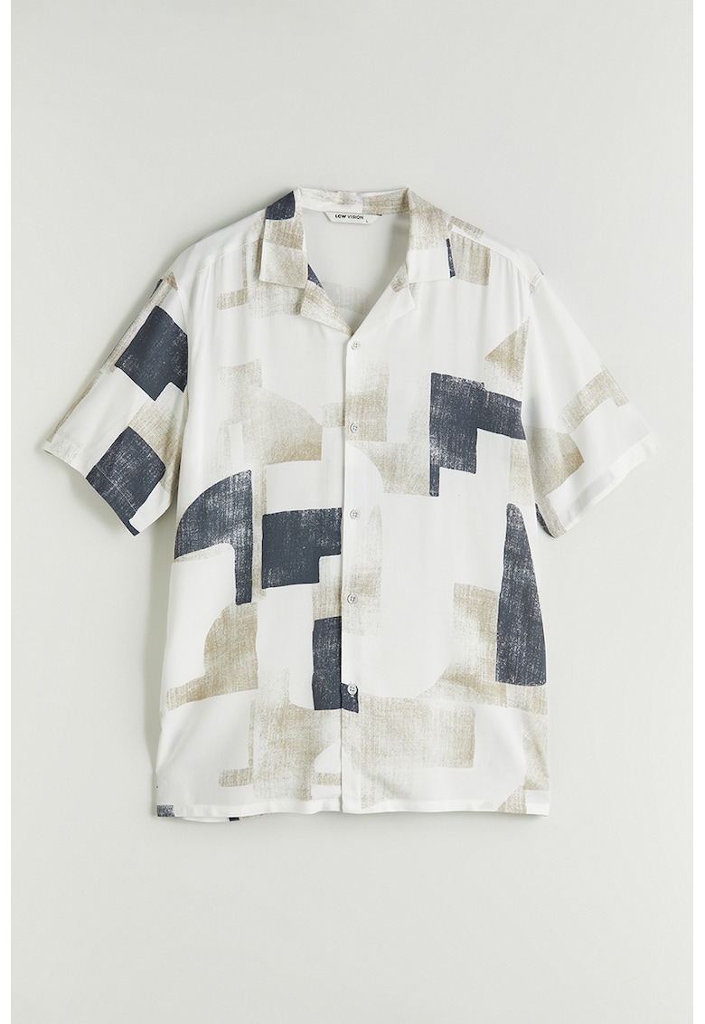 - alb murdar Material: poliester Imprimeu: abstract Stil: casual Croiala: regular fit Guler: cu revere decupate Lungime maneca: maneca scurta Sistem inchidere: nasturi Compozitie Exterior: 99% poliester