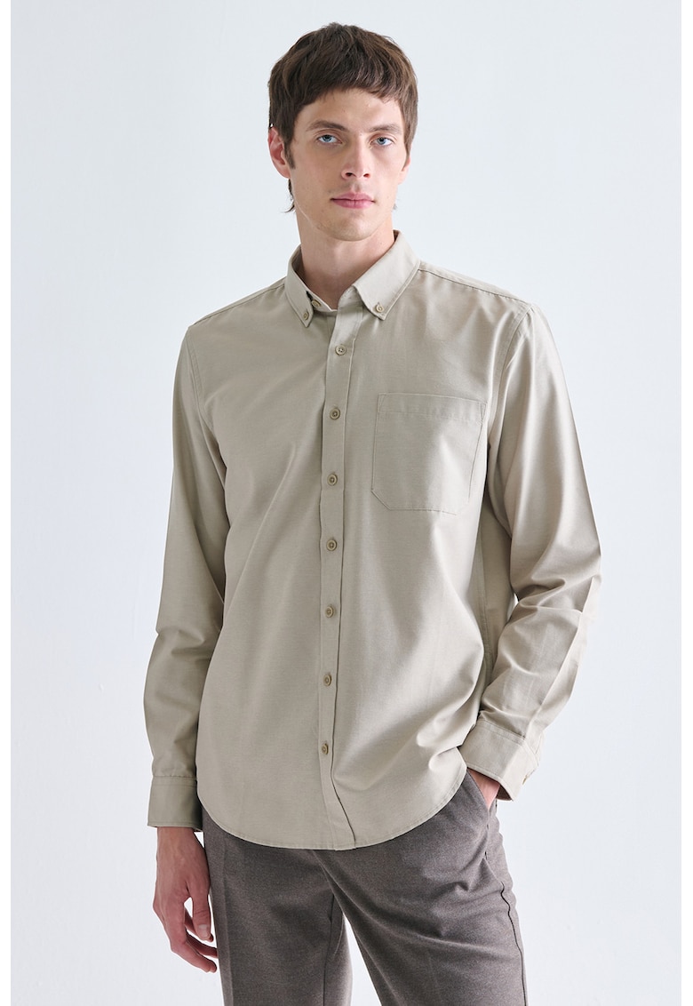 Caracteristici Culoare: grej Material: bumbac Imprimeu: uni Stil: casual Croiala: regular fit Guler: fixat cu nasturi Maneci: cu mansete cu nasturi Lungime maneca: maneca lunga Buzunare: unul aplicat pe piept Sistem inchidere: nasturi Compozitie Exterior: 100% bumbac