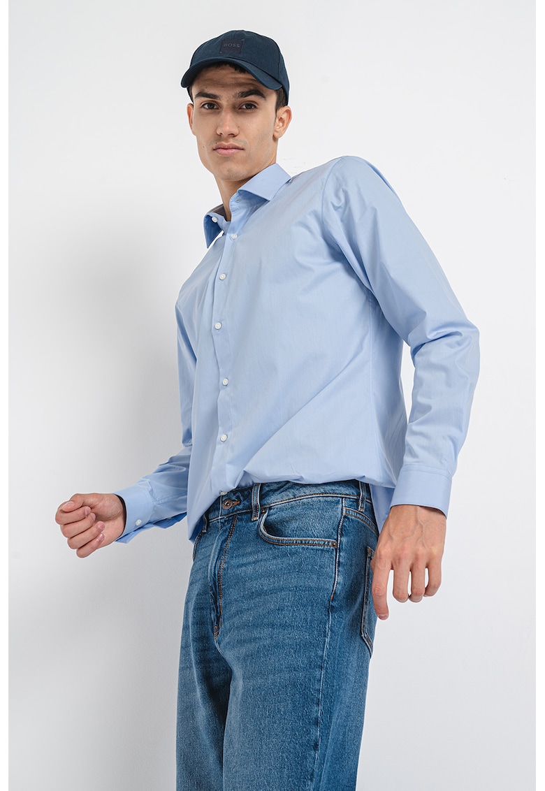 Caracteristici Culoare: albastru pastel Material: bumbac Imprimeu: uni Stil: elegant Croiala: regular fit Guler: ascutit Lungime maneca: maneca lunga Sistem inchidere: nasturi Compozitie Exterior: 100% bumbac Info model Modelul poarta un produs de marimea 39. Marimi model: 178 cm inaltime