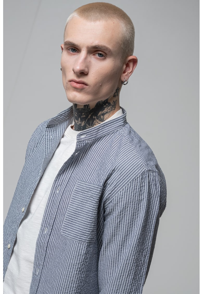 - bleumarin Material: bumbac Imprimeu: dungi Stil: casual Croiala: slim fit Guler: mao Maneci: cu mansete cu nasturi Lungime maneca: maneca lunga Buzunare: unul aplicat pe piept Sistem inchidere: nasturi Compozitie Exterior: 100% bumbac Info model Modelul poarta un produs de marimea M. Marimi model: 188 cm inaltime