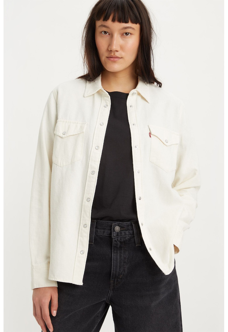 Caracteristici Culoare: alb murdar Imprimeu: uni Stil: casual Material: denim Croiala: regular fit Guler: ascutit Tip maneca: mansete cu capse Lungime maneca: maneca lunga Buzunare: 2 cu clapa pe piept Sistem inchidere: capse Compozitie Exterior: 76% bumbac