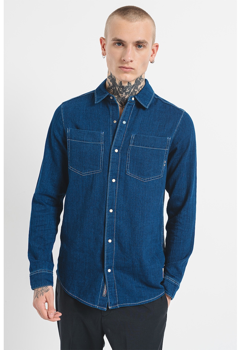 Caracteristici Culoare: bleumarin Material: denim Imprimeu: uni Stil: casual Croiala: regular fit Guler: clasic Lungime maneca: maneca lunga Detalii: cusaturi contrastante Sistem inchidere: capse Compozitie Exterior: 100% bumbac Info model Modelul poarta un produs de marimea M. Marimi model: 188 cm inaltime