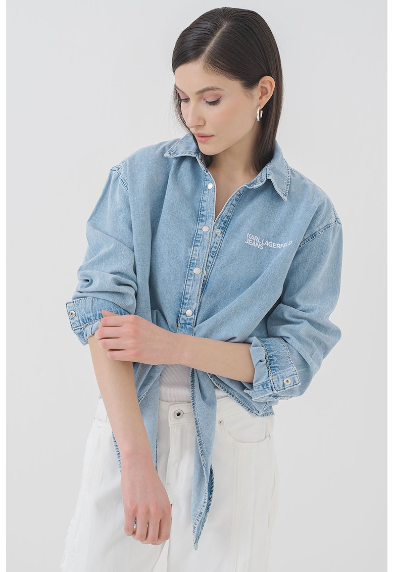 Caracteristici Culoare: albastru deschis Imprimeu: uni Stil: casual Material: denim Croiala: lejer Guler: clasic Lungime maneca: maneca lunga Detalii: logo Sistem inchidere: nasturi Compozitie Exterior: 100% bumbac Info model Modelul poarta un produs de marimea S. Marimi model: 176 cm inaltime