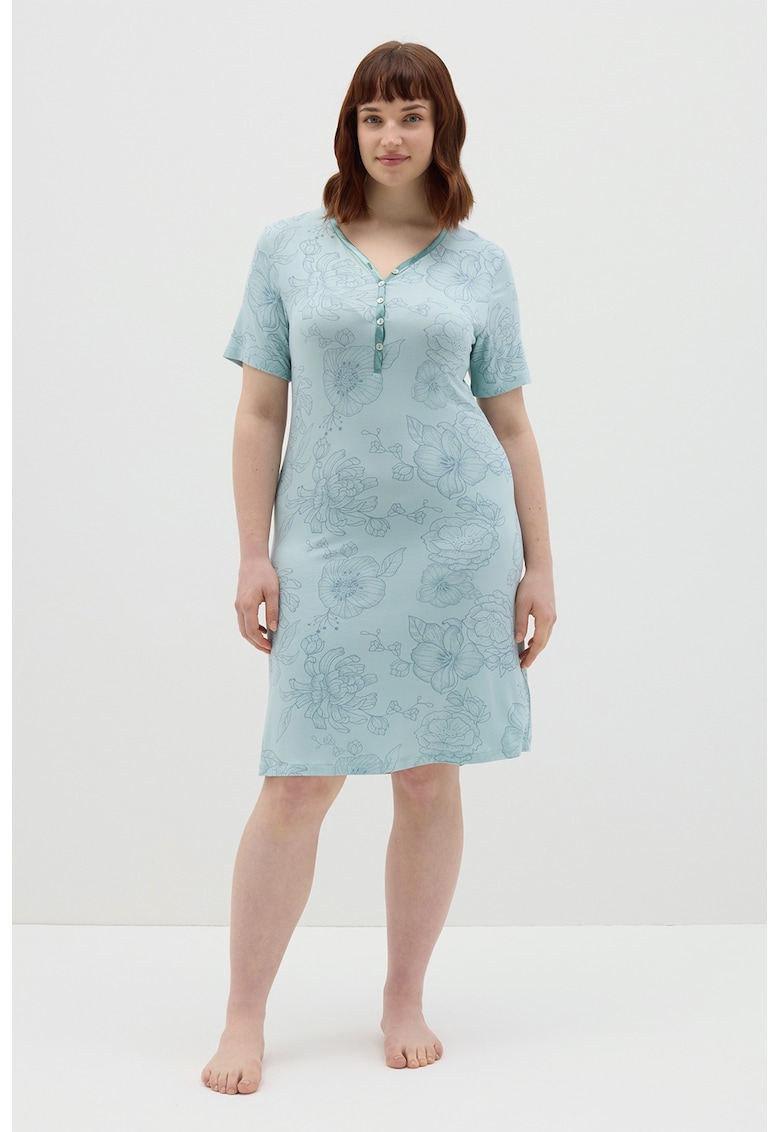 Caracteristici Tip produs: camasa de noapte Culoare: albastru pastel Material: viscoza Imprimeu: floral Decolteu: in v Croiala: regular fit Lungime maneca: maneca scurta Detalii: fenta scurta cu nasturi Sistem inchidere: fara inchidere Compozitie Exterior: 95% viscoza