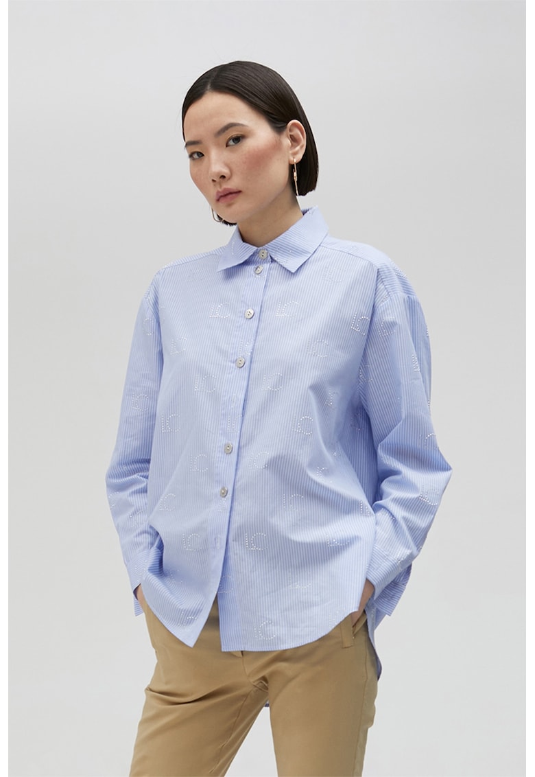 - albastru pastel Imprimeu: dungi Stil: casual Material: bumbac Croiala: regular fit Guler: clasic Tip maneca: ampla Lungime maneca: maneca lunga Detalii: aplicatii din strasuri Sistem inchidere: nasturi Compozitie Exterior: 100% bumbac