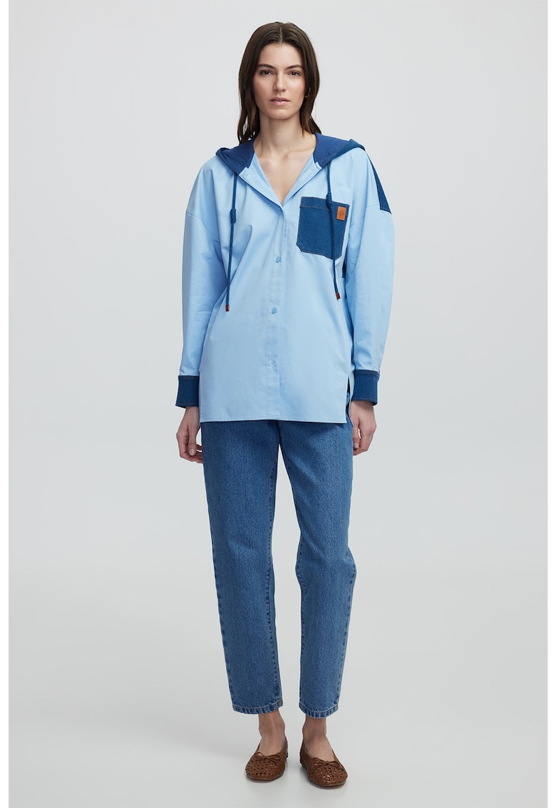 Caracteristici Culoare: albastru deschis Imprimeu: uni Stil: casual Material: bumbac Croiala: regular fit Lungime maneca: maneca lunga Buzunare: unul aplicat pe piept Detalii: slituri laterale la terminatie Sistem inchidere: nasturi Compozitie Exterior: 100% bumbac