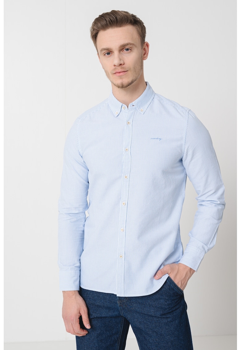 - albastru deschis Material: bumbac Imprimeu: dungi Stil: elegant Croiala: regular fit Lungime maneca: maneca lunga Sistem inchidere: nasturi Compozitie Exterior: 100% bumbac Info model Modelul poarta un produs de marimea M. Marimi model: 191 cm inaltime
