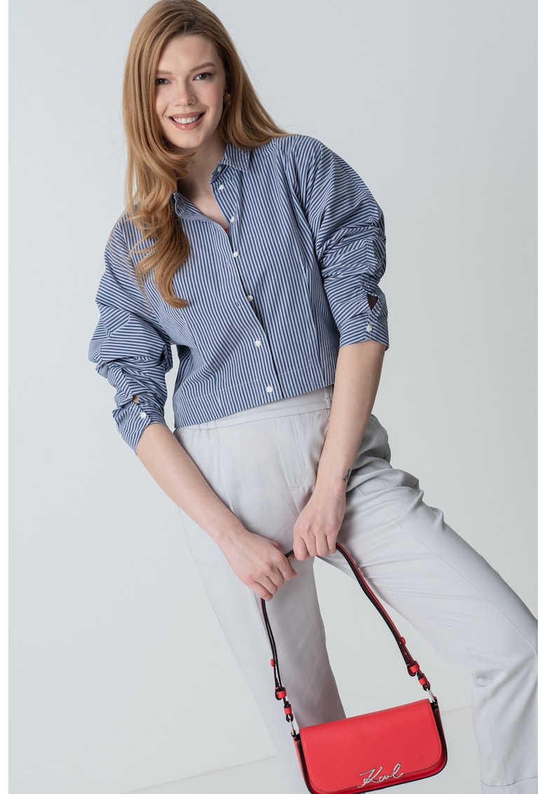 Caracteristici Culoare: albastru Imprimeu: dungi Stil: casual Material: bumbac Croiala: lejer Guler: ascutit Lungime maneca: maneca lunga Sistem inchidere: nasturi Compozitie Exterior: 100% bumbac Info model Modelul poarta un produs de marimea S. Marimi model: 176 cm inaltime