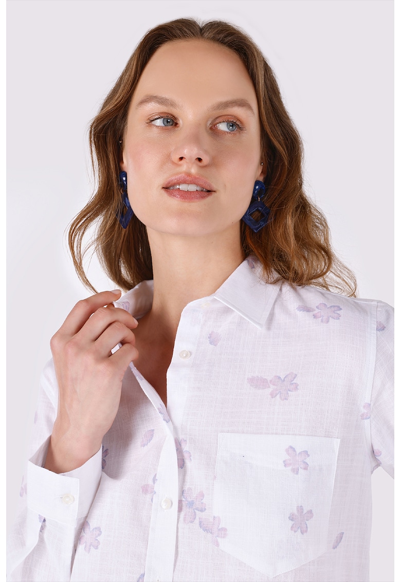 Caracteristici Culoare: alb Imprimeu: floral Stil: casual Material: bumbac Croiala: regular fit Guler: clasic Tip maneca: cu mansete cu nasturi Lungime maneca: maneca lunga Buzunare: unul aplicat pe piept Sistem inchidere: nasturi Compozitie Exterior: 100% bumbac