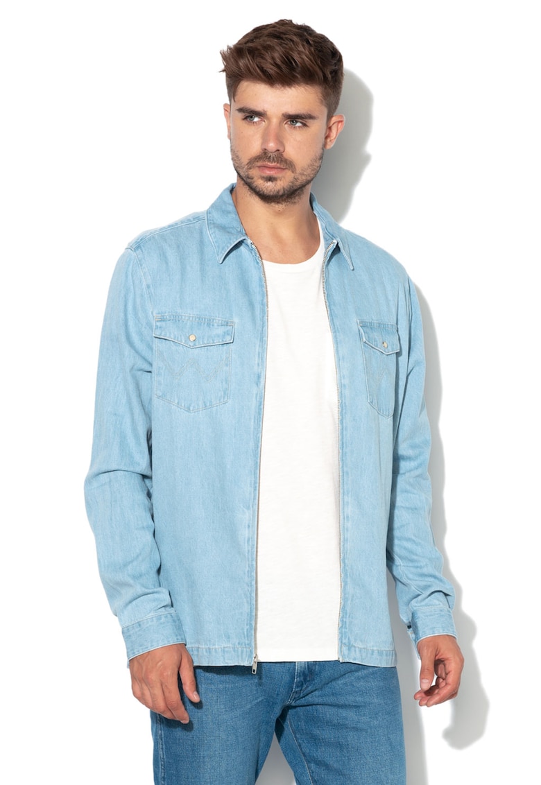 - denim Imprimeu: uni Stil: casual Croiala: regular fit Guler: ascutit Maneci: mansete cu nasturi Lungime maneca: maneca lunga Buzunare: 2 buzunare cu capsa