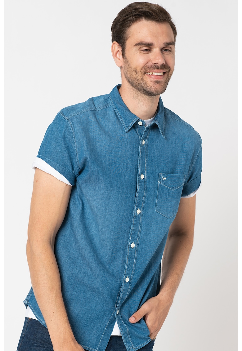 Caracteristici Culoare: albastru Material: denim Imprimeu: uni Stil: casual Croiala: regular fit Guler: clasic Lungime maneca: maneca scurta Buzunare: aplicat pe piept Sistem inchidere: nasturi Compozitie Exterior: 100% bumbac Info model Modelul poarta un produs de marimea M. Marimi model: 195 cm inaltime