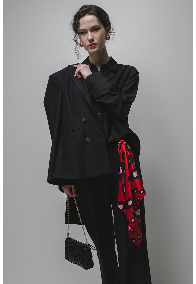 Caracteristici Culoare: negru Imprimeu: uni Stil: elegant Material: satin Croiala: regular fit Guler: ascutit Lungime maneca: maneca lunga Buzunare: 2 pe piept Sistem inchidere: nasturi Compozitie Exterior: 85% viscoza