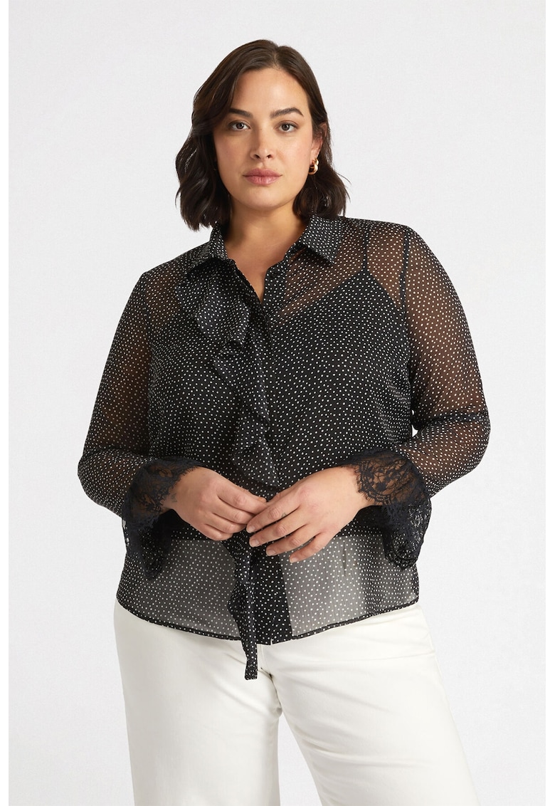 Caracteristici Culoare: negru Imprimeu: buline Stil: elegant Material: sintetic Croiala: curvy Guler: clasic Tip maneca: cu mansete din dantela Lungime maneca: maneca lunga Detalii: volane
