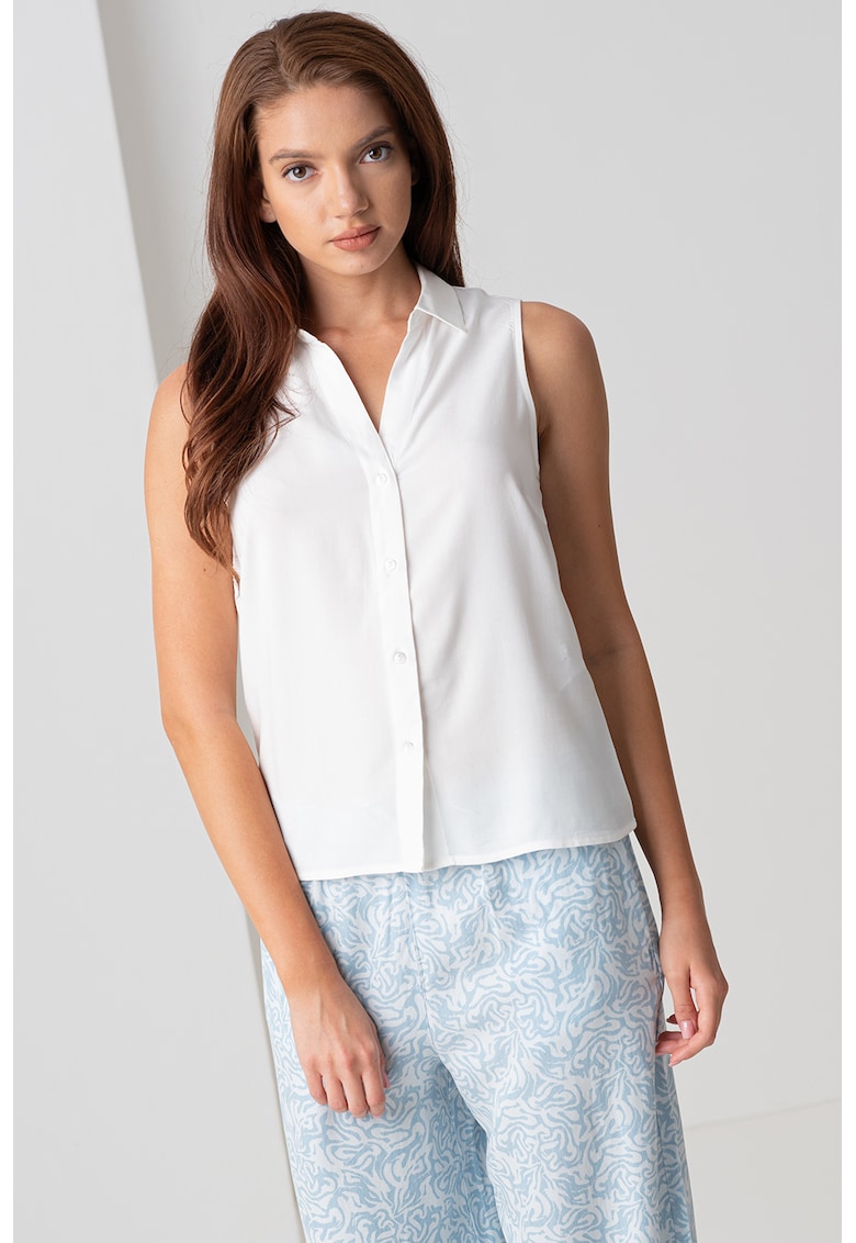 Caracteristici Culoare: alb Imprimeu: uni Stil: casual Material: viscoza Croiala: regular fit Guler: ascutit Lungime maneca: fara maneca Sistem inchidere: nasturi Compozitie Exterior: 100% viscoza Info model Modelul poarta un produs de marimea S. Marimi model: 174 cm inaltime