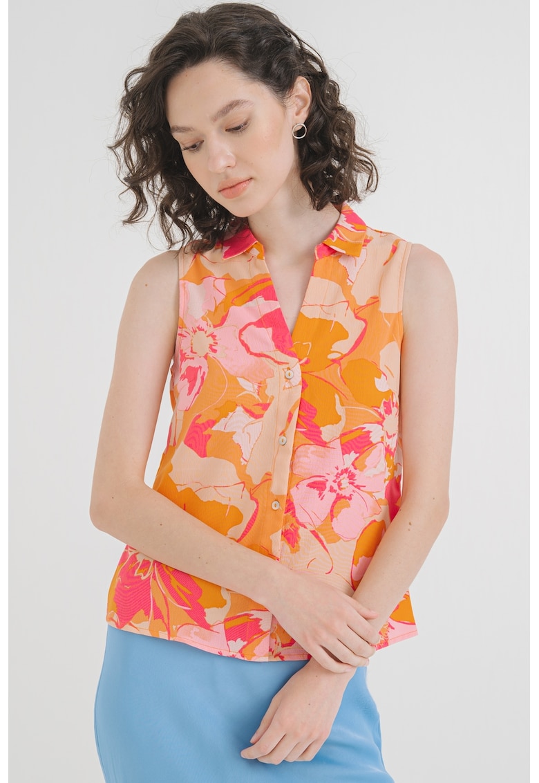 - roz Imprimeu: floral Stil: casual Material: sintetic Croiala: regular fit Guler: clasic Lungime maneca: fara maneca Sistem inchidere: nasturi Compozitie Exterior: 50% poliester reciclat