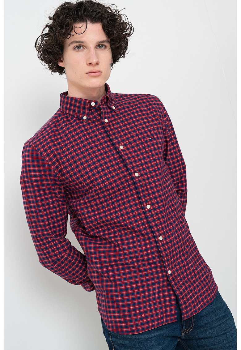 - bleumarin Material: bumbac Imprimeu: carouri Stil: casual Croiala: regular fit Lungime maneca: maneca lunga Sistem inchidere: nasturi Compozitie Exterior: 100% bumbac regenerativ Info model Modelul poarta un produs de marimea M. Marimi model: 189 cm inaltime