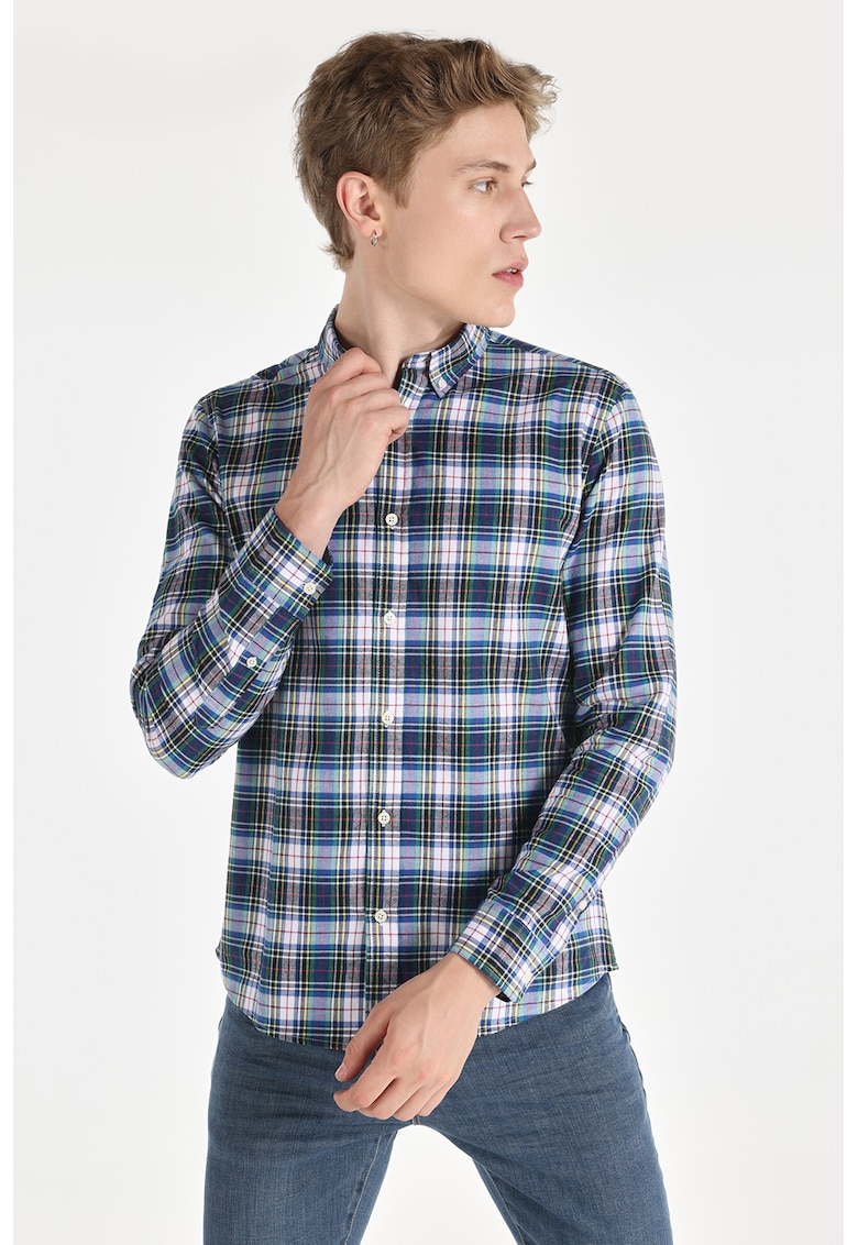 - albastru Material: bumbac Imprimeu: carouri Stil: casual Croiala: regular fit Guler: fixat cu nasturi Maneci: mansete cu nasturi Lungime maneca: maneca lunga Sistem inchidere: nasturi Compozitie Exterior: 100% bumbac